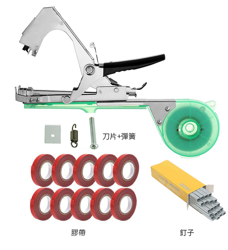 半小時前綁枝好幫手,綑綁省時省力 ?超高效率,只需2秒即完成綁枝 ?適用於番茄、黃瓜、葡萄、豆子、茄子等莖蔓類植物綑綁 - 【黑金剛綁枝機】+刀片+彈簧+20卷加厚膠帶+1盒釘(1萬枚 )